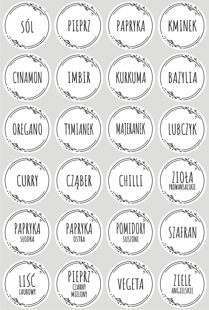 Zestaw naklejek na przyprawy, zioła oraz inne artykuły spożywcze. Dzięki naszym etykietom znacznie łatwiej znajdziesz przyprawy w spiżarni czy w szufladzie. Naklejki można przykleić na front pojemniczka, nakrętkę słoika czy w inne miejsce na dowolnym opakowaniu. Zachowaj porządek w swojej kuchni, a przygotowanie posiłku będzie dla Ciebie prostsze, szybsze i przyjemniejsze.